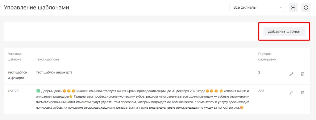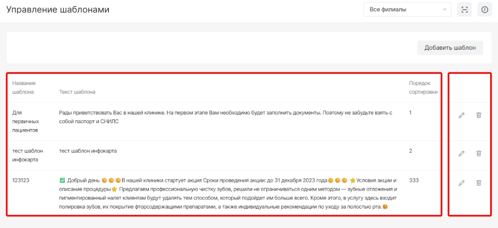 После сохранения шаблон отобразится в списке и с ним будут доступны опции: