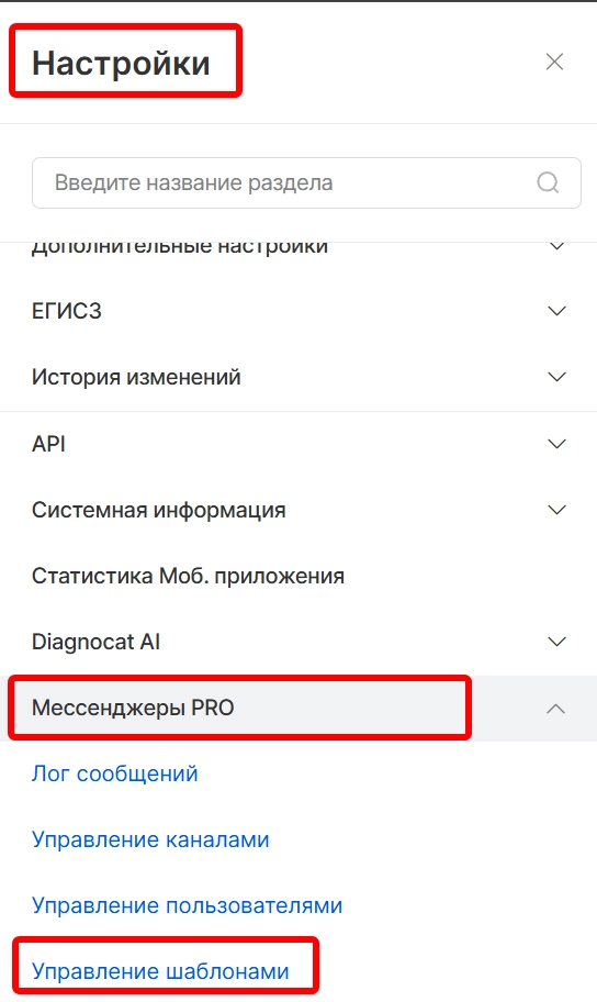 Для создания текстовых шаблонов для быстрой вставки в диалог в мессенджерах необходимо перейти в модуль “Настройки”, открыть раздел “Мессенджеры PRO” и выбрать “Управление шаблонами”