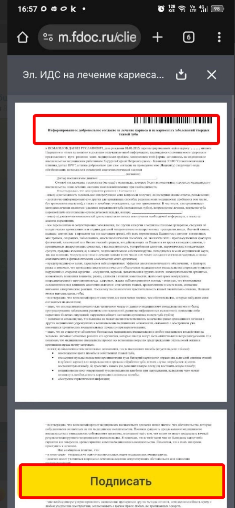 пациент или законный представитель получают смс для электронного подписания документа с типом ИДС
