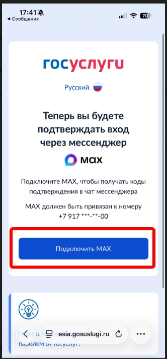 после выдачи разрешения откроется страница для подключения мессенджера МАХ для получения кода подтверждения идентификации через Госуслуги