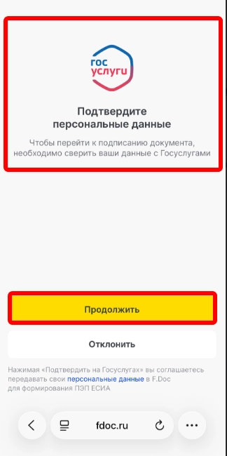 после перехода по ссылке откроется уведомление о необходимости подтверждения персональных данных и необходимо нажать “продолжить”