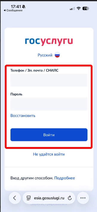 после подтверждения перехода откроется официальный сайт Госуслуг и необходимо ввести логин и пароль от своих госуслуг и нажать “Войти”