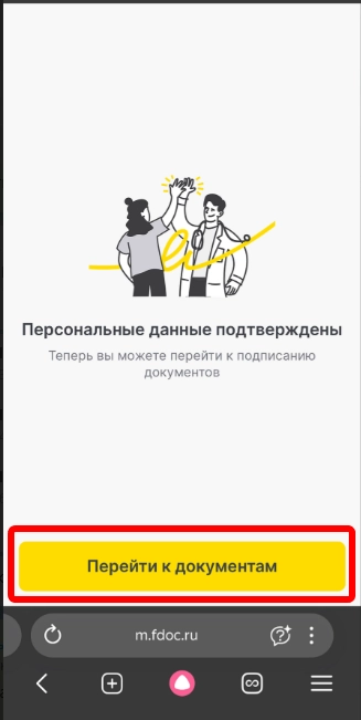 после завершения и успешной идентификации на странице подписания электронного документа отобразится уведомление об успешном подтверждении и необходимо нажать “Перейти к документам”