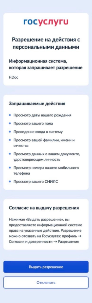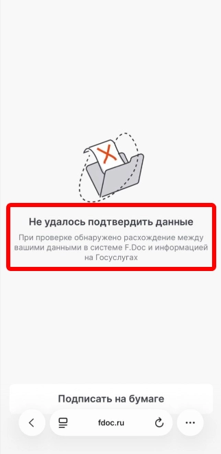 ВНИМАНИЕ! Если после выдачи разрешения обнаружилось несоответствие персональных данных, указанных в Госуслугах и данных в сервисе F.DOC выйдет уведомление об ошибке и просьбой подписать документы обычным способом на бумаге