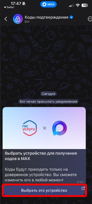 После подключения MAX откроется само приложение мессенджера на телефоне для выбора его как устройства для получения кодов