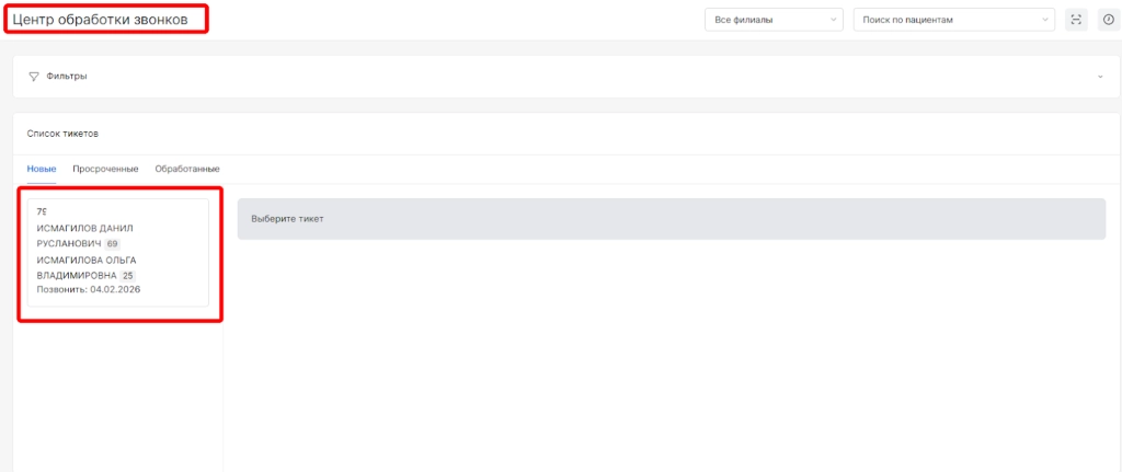 Для использования возможности необходимо перейти в модуль “Центр обработки звонков” и найти тикет несовершеннолетнего пациента