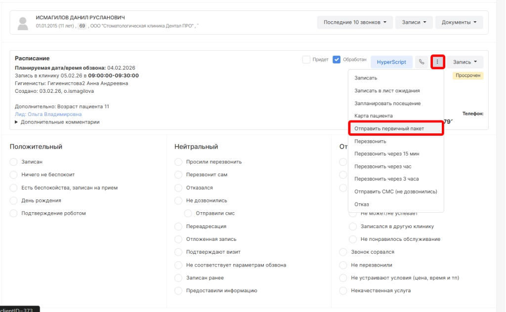 Для экономии времени работы с первичными пациентами в системе предусмотрена возможность отправки первичного пакета документов в момент напоминания о визите через Центр обработки звонков.