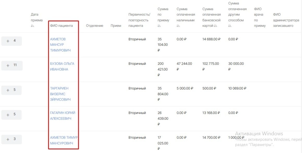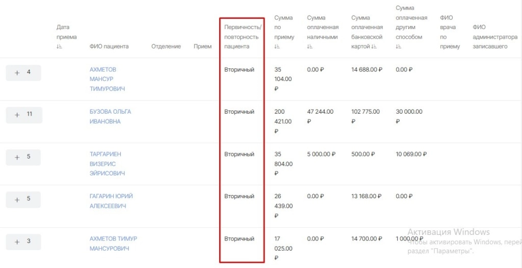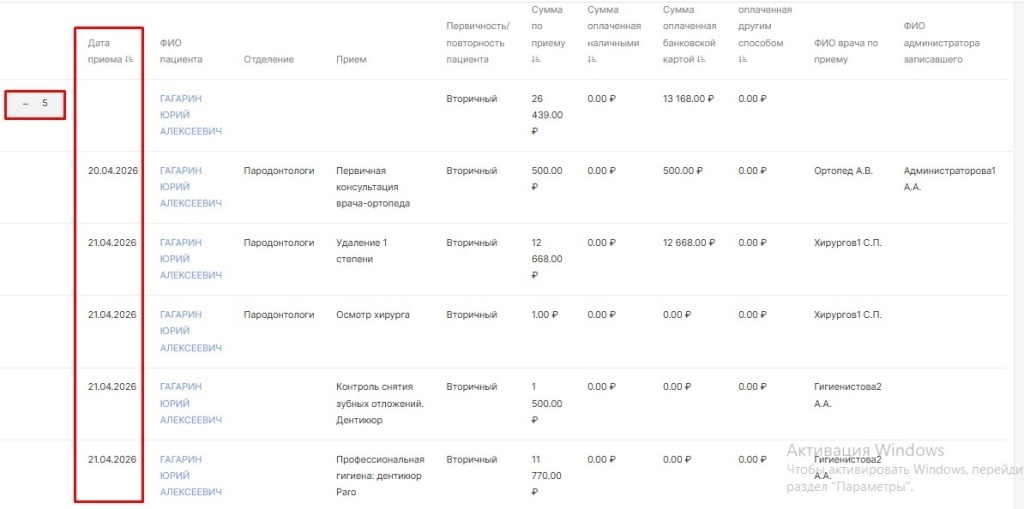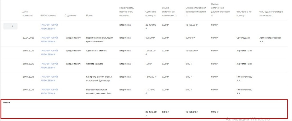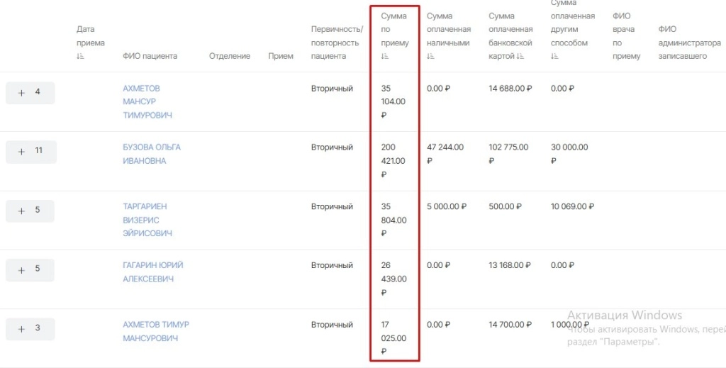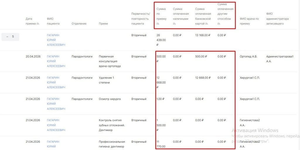 Колонки “Сумма по приему” “Сумма оплаченная наличными” “Сумма оплаченная банковской картой” и “Сумма оплаченная другим способом” отображают информацию отдельно по каждому приему