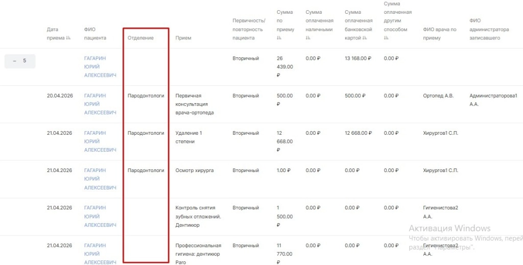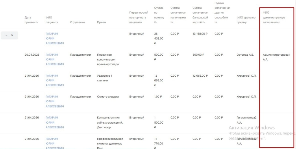“ФИО администратора записавшего” отображает информацию по ФИО администратора, который записал пациента на прием