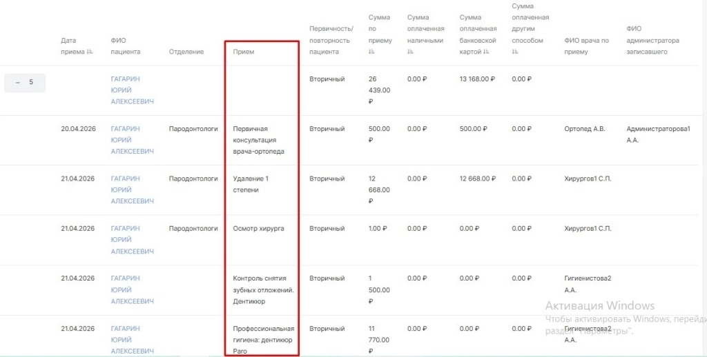 “Прием” отражает отдельно наименование приемов, которые были оказаны пациенту