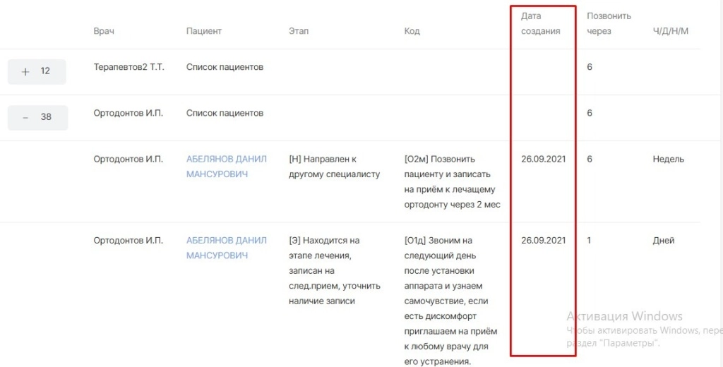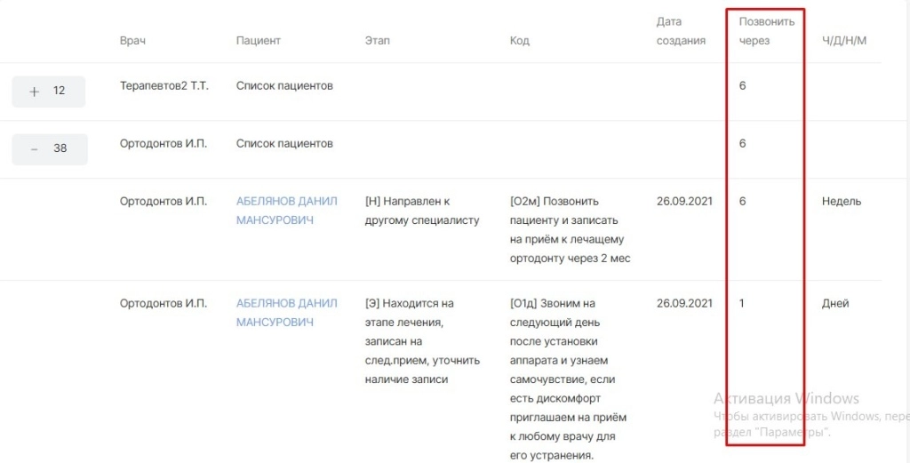 Инфоблок собирает все установленные пациентам Этапы и Коды “Заботливого доктора”