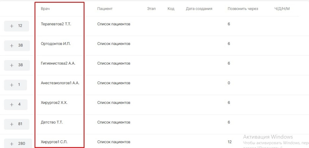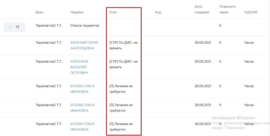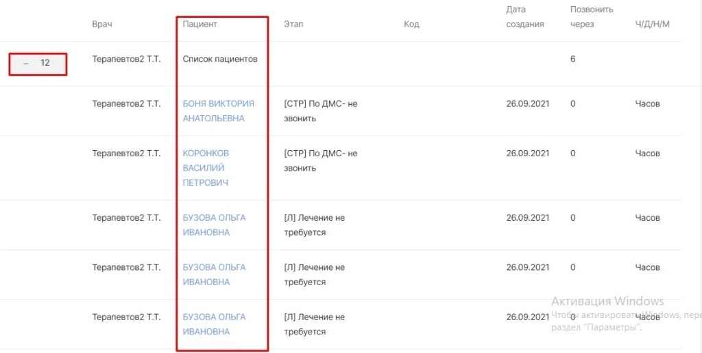“ФИО пациента” отображает ФИО пациента, при нажатии на которые произойдет переход в информационную карту пациента