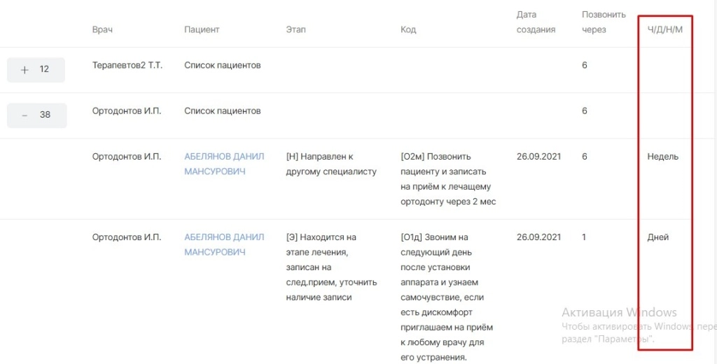 “Ч/Д/Н/М” отображается через сколько нужно позвонить часов/дней/недель/месяцев