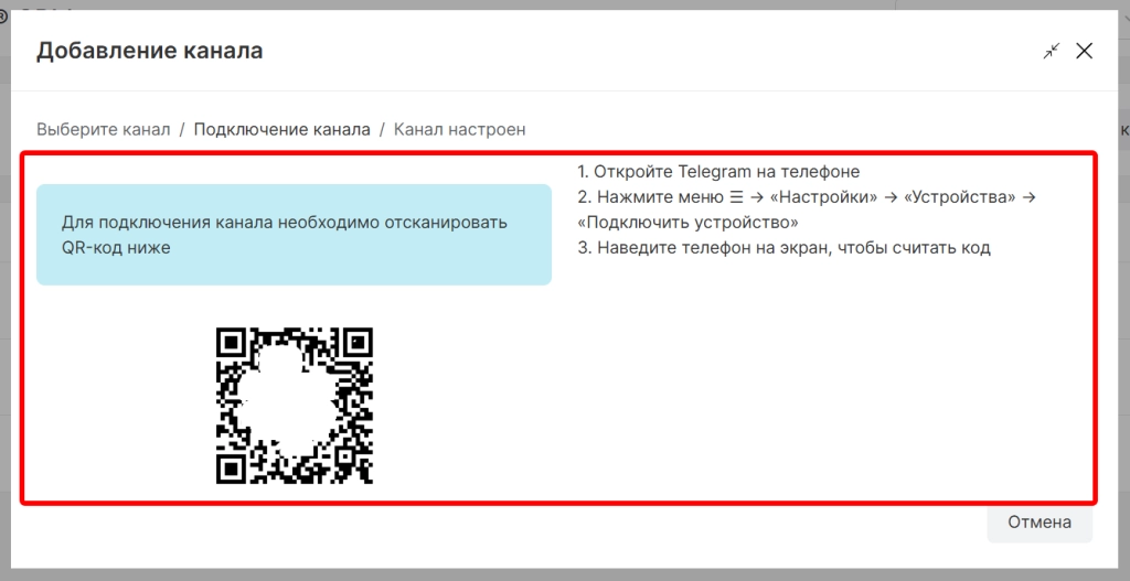 После завершения настройки канал отобразится в списке со статусом “Канал активен”.