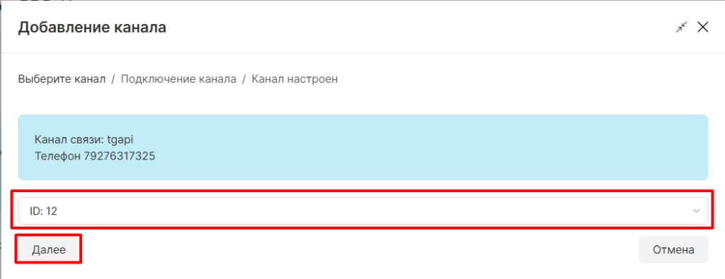 В открывшемся окне указываем ID канала и нажимаем кнопку “Далее”.