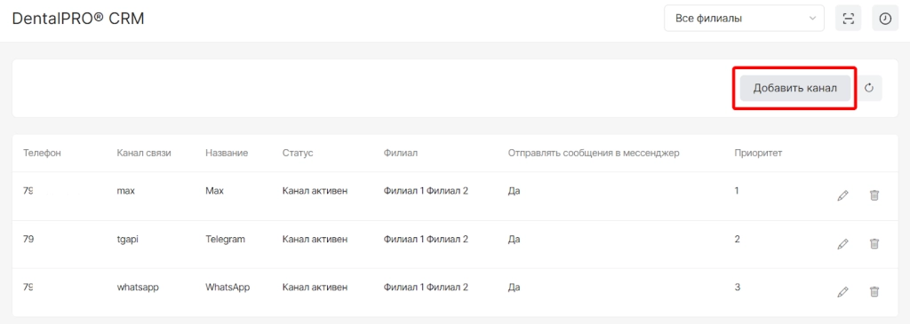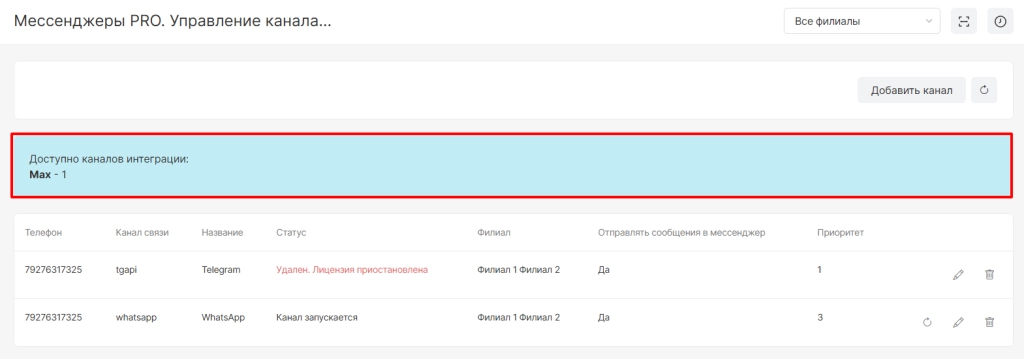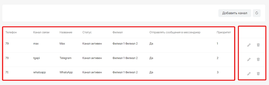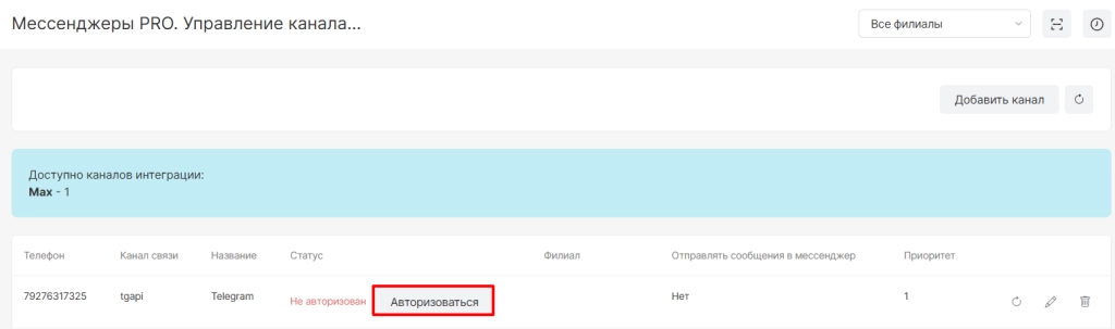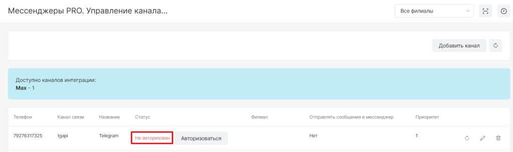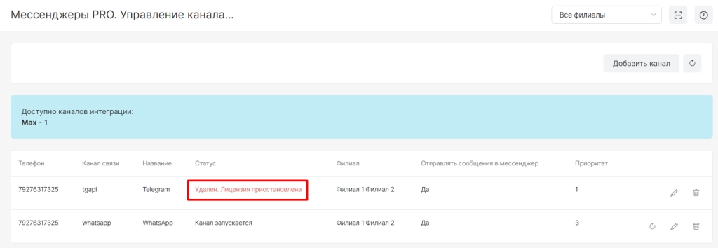 После завершения настройки канал отобразится в списке со статусом “Канал активен” и с ним будут доступны опции: