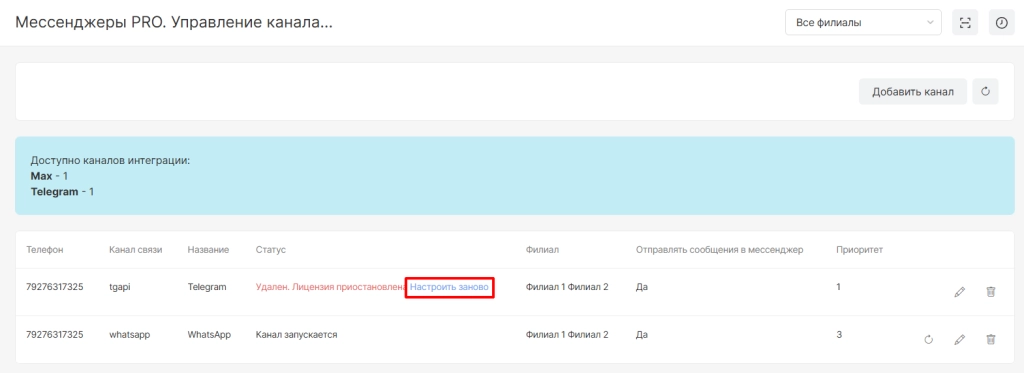После продления лицензии канала будет доступна настройка для переподключения, кликнув на кнопку “Настроить заново”.
