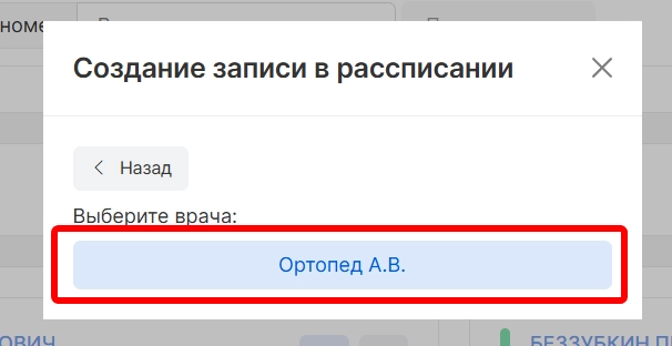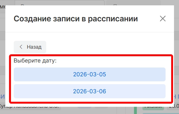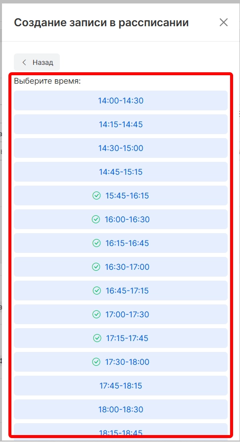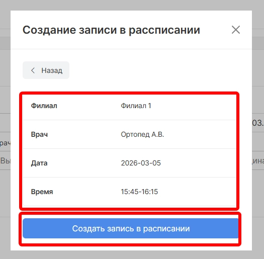 проверить итоговые параметры для создания записи и подтвердить опцией “Создать запись в расписании”.