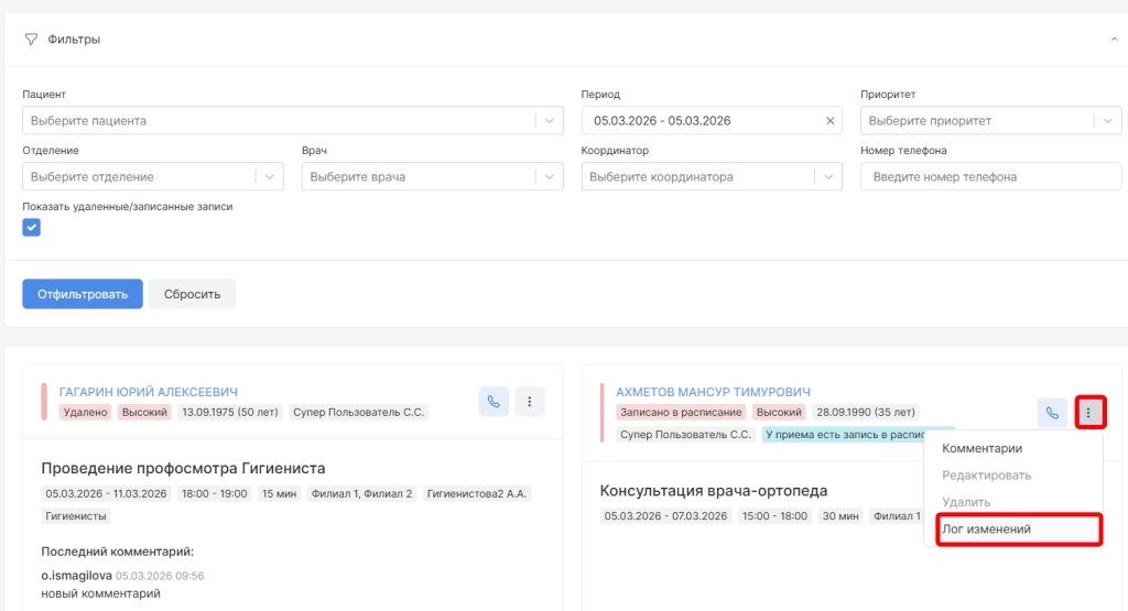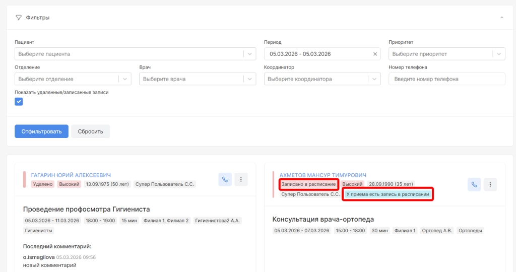 После записи пациент не будет отображаться в списке, но можно найти историю обработки его записи в листе ожидания. Для этого в поле фильтрации необходимо выбрать параметр “Показать удалённые/записанные записи” и нажать “Отфильтровать”
