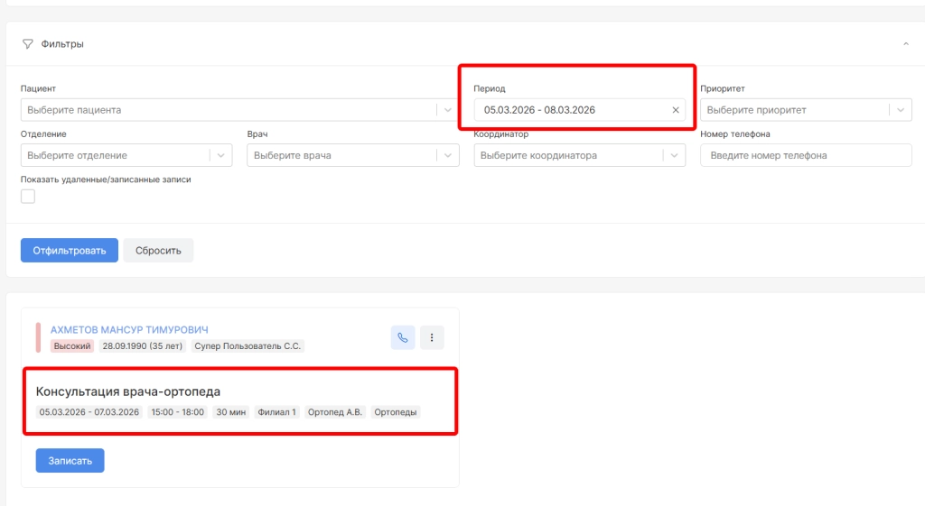 Ниже отобразится список пациентов для обработки. Например, при выборе фильтрации по параметру “Период” с указанием ближайшей недели отобразятся пациенты, желающие на этой неделе попасть на прием к врачу.
