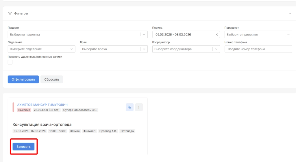 Под записью пациентов, для которых освободился подходящий слот, будет активна кнопка “Записать”.