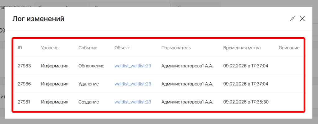 можно будет отследить историю пациента от добавления в лист ожидания до обновления по причине записи с указанием даты и инициаторов действия.