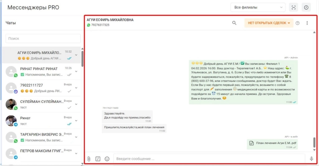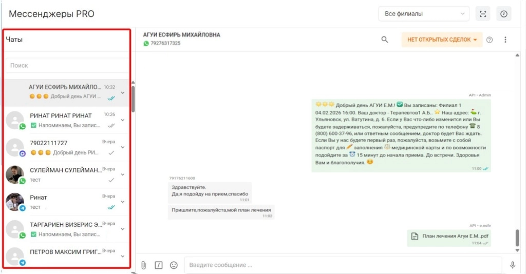 Мессенджеры - это канал коммуникации с пациентами для входящих и исходящих сообщений. В рамках одного модуля доступна коммуникация с клиентами через разные мессенджеры одновременно.