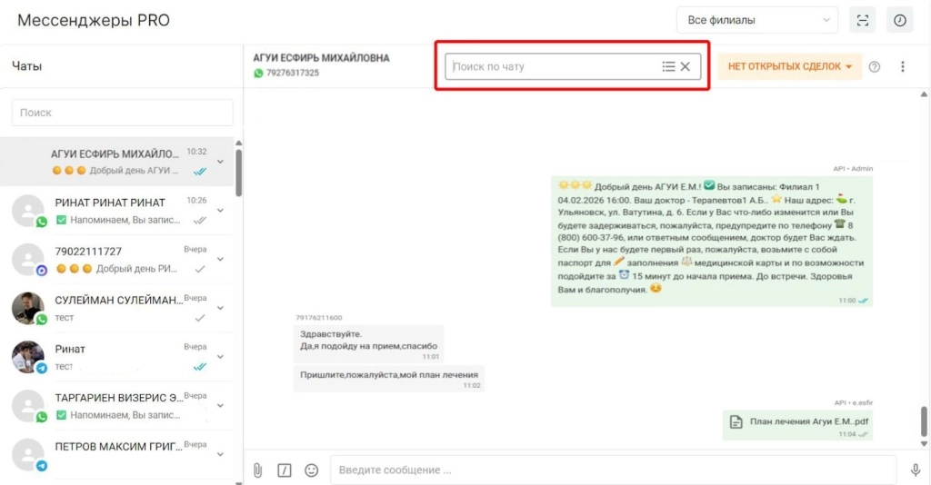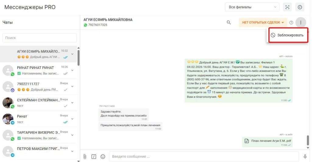 ВНИМАНИЕ! Отображение списка чатов определяется уровнем доступа, который настраивается для каждого сотрудника. Более подробно ознакомиться с уровнями доступа и их настройкой можно в статье “Настройка прав доступа”.