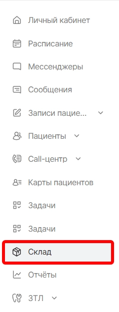 Внимание! Для работы с данным модулем необходимо его приобрести. Ознакомиться с тарифами можно в разделе DentalStore.Для работы со складом необходимо перейти в данный модуль. (в меню слева нажать на кнопку «Склад», после чего открывается нужный модуль).