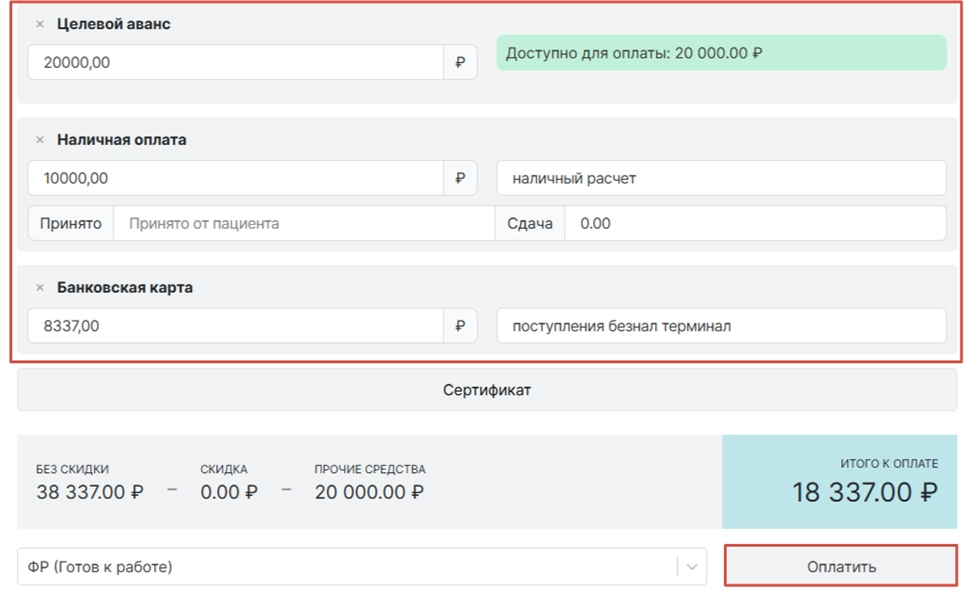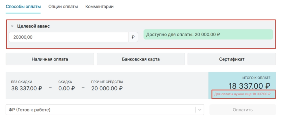 После чего в разделе «Способы оплаты» уже будет указано, что за данный приём был взят «Целевой аванс» с указанием суммы. Если «Целевой аванс» брался не в 100% размере, то необходимо применить смешанную форму оплату.
