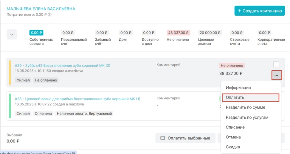 Когда наступит время фактического проведения приёма врачом, в модуле касса создастся квитанция на всю стоимость приёма. Название квитанции будет равно названию приёма. Необходимо, нажав на «Троеточие», выбрать функцию «Оплатить».