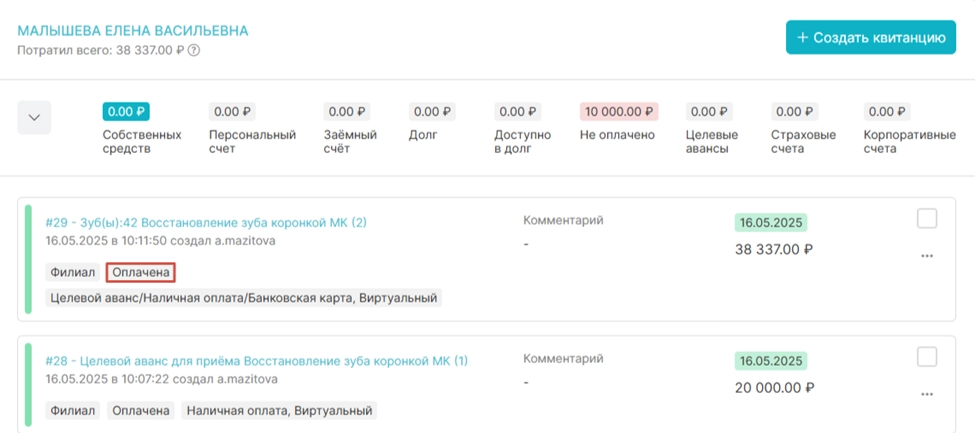 Квитанция получает статус «Оплачена».
