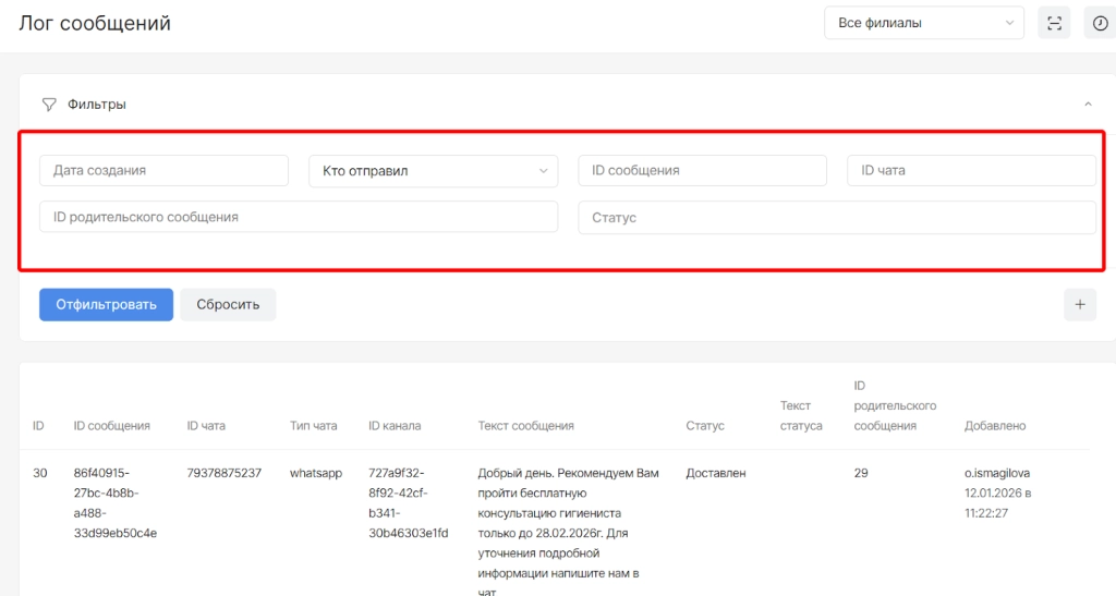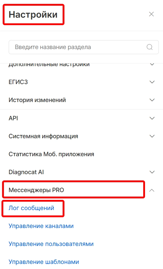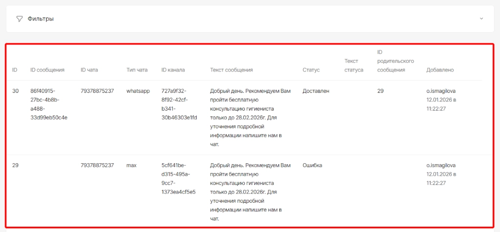 Для просмотр истории сообщений и статусах доставки необходимо перейти в модуль “Настройки”, открыть раздел “Мессенджеры PRO” и выбрать “Лог сообщений”