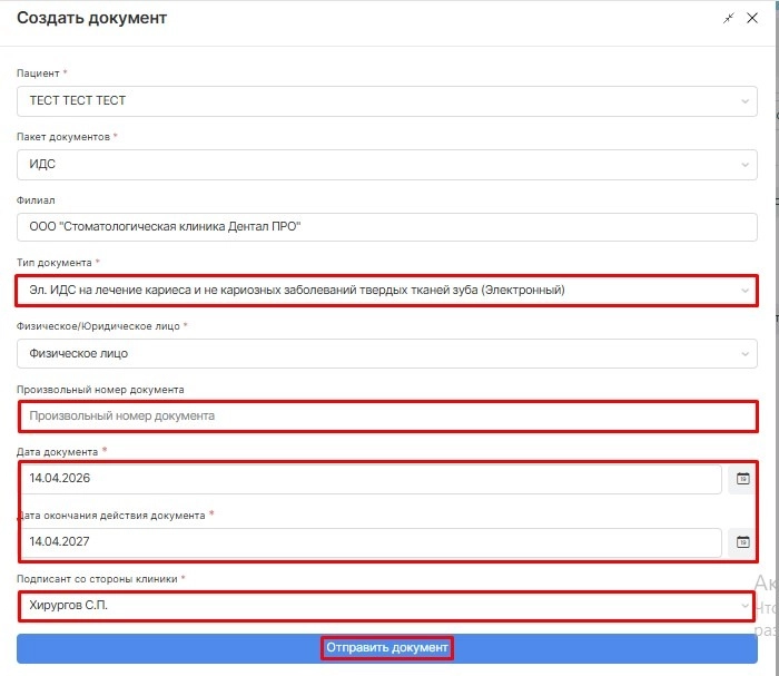 После ввода кода доктора из смс необходимо нажать “Отправить” для отправки документа пациенту