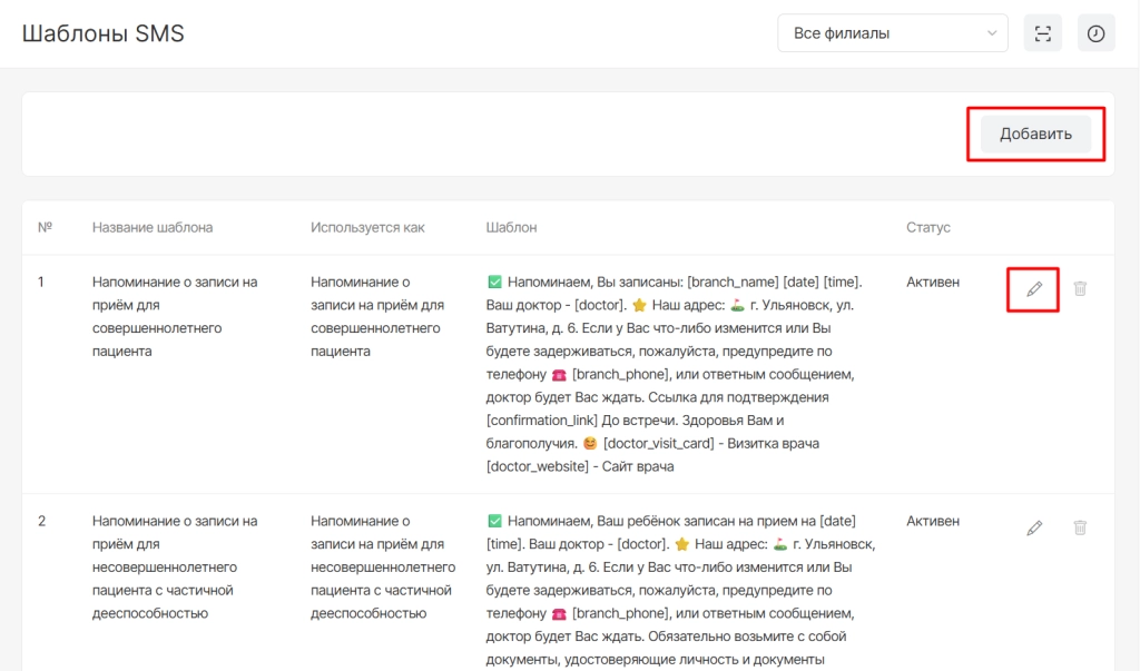 ВНИМАНИЕ! Отправка сайта и визитки доктора доступна для типов напоминание о записи и перевод приема в факт