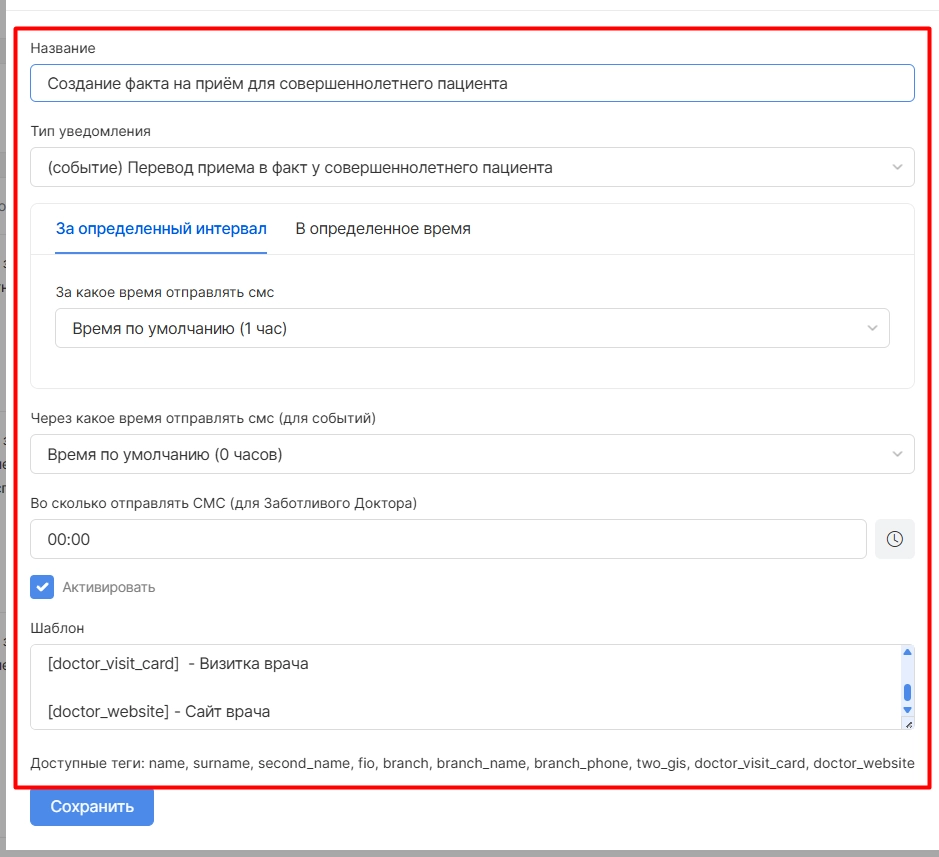 ВНИМАНИЕ! Для типа напоминаний о записи подходит настройка за определенные интервалы или в определенное время, для типа события создание факта подходит настройка в поле “через какое время отправлять смс для событий)