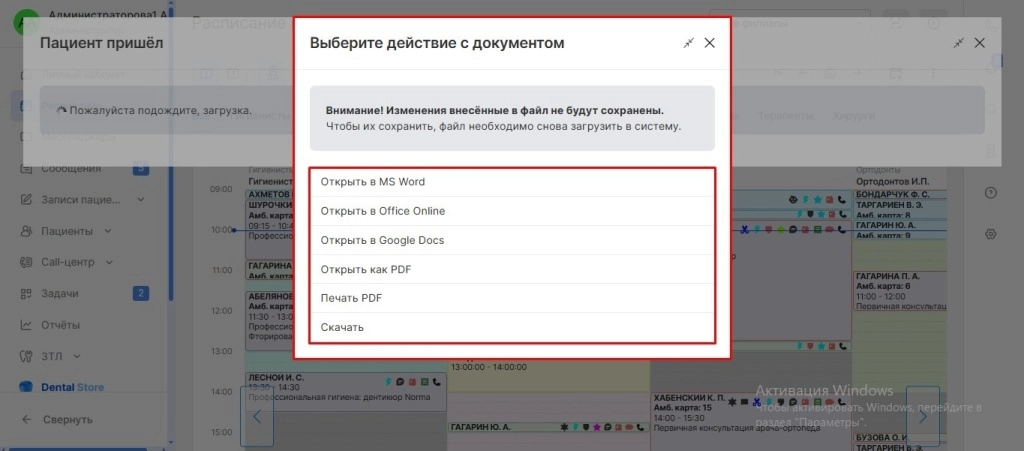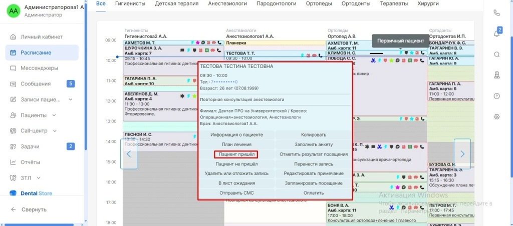 В открывшимся окне требуется нажать кнопку “Пациент пришел”