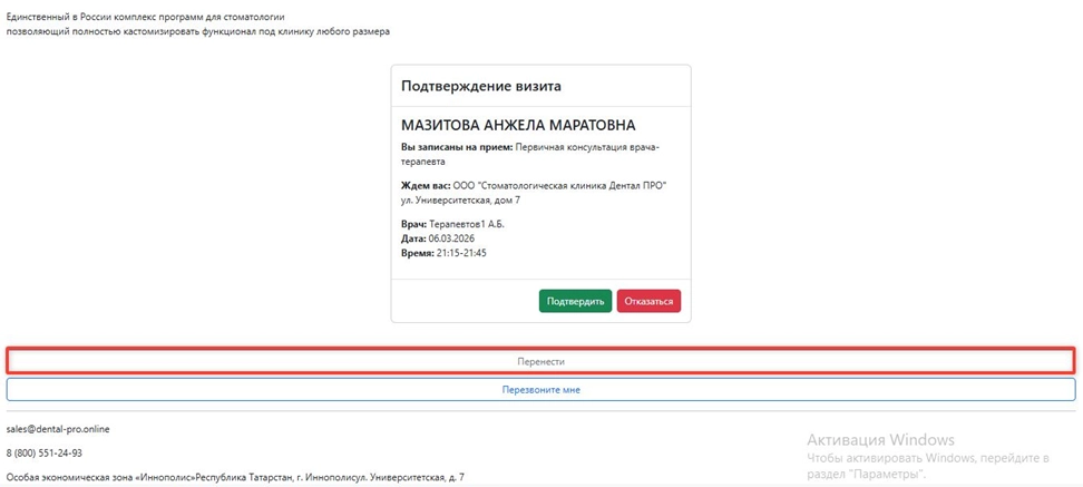 В случае, если пациент хочет перенести свой прием, на открывшейся странице необходимо выбрать опцию “Перенести”.
