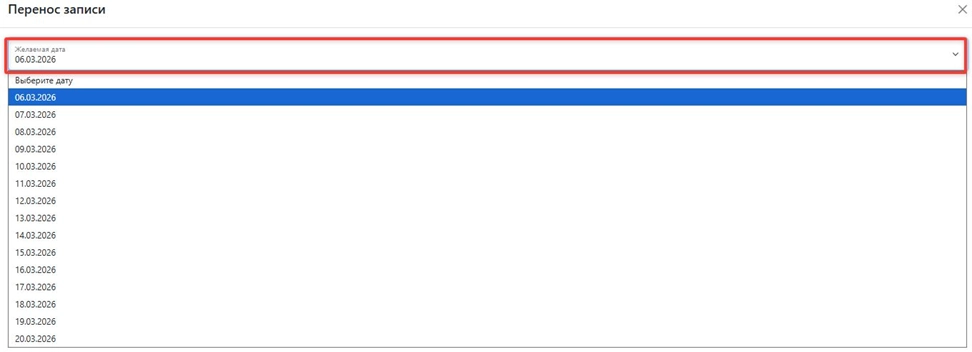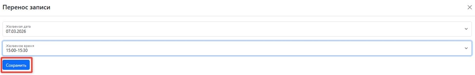 Запись пациента в расписании перенесется на выбранные дату и время.