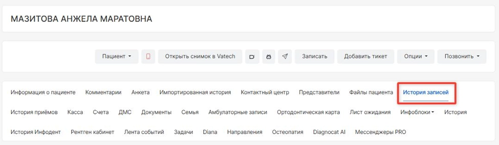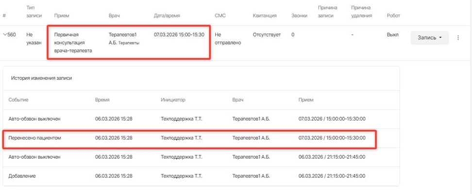 Также информация о переносе записи отобразится в информационной карте пациента, в разделе “История записей”.