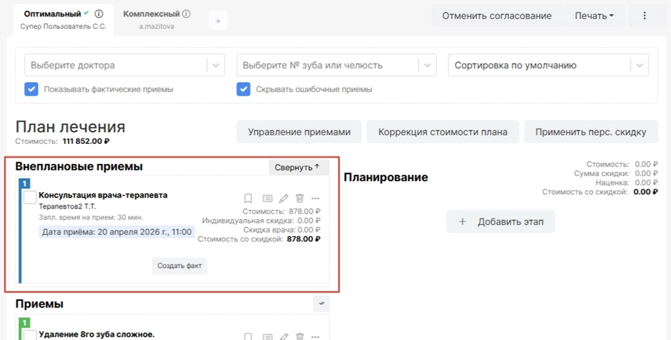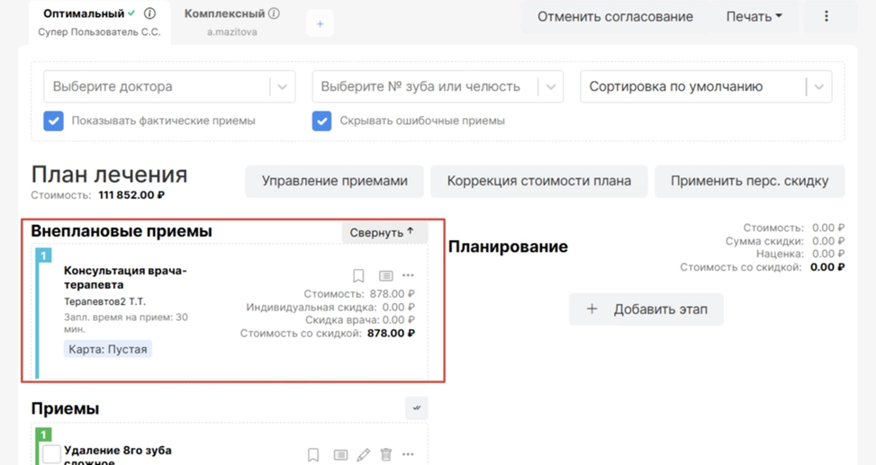 В любом плане лечения сверху будет находиться блок “Внеплановые приемы"