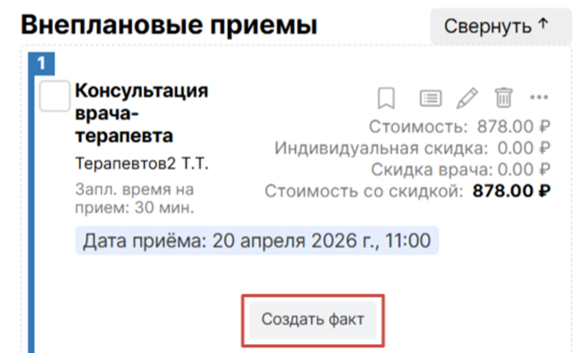 Далее на приеме необходимо нажать на опцию “Создать факт”