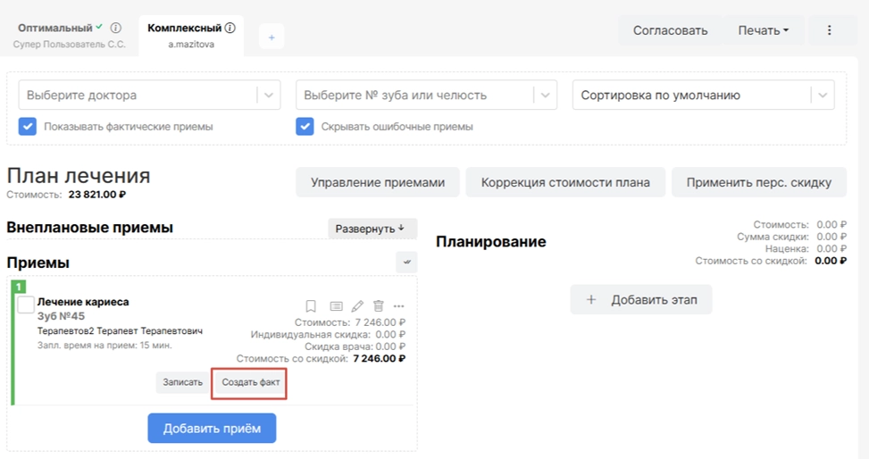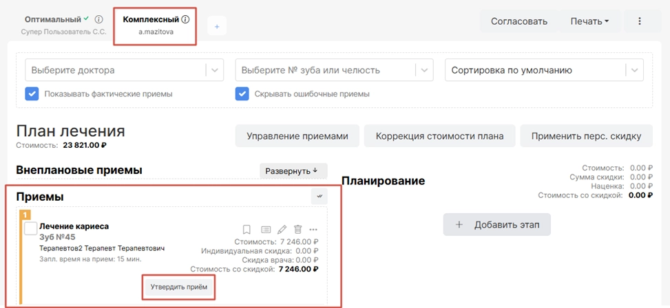 Для этого необходимо в предложенном плане лечения создать и утвердить прием, который проводится сегодня на консультации
