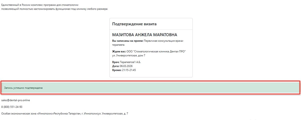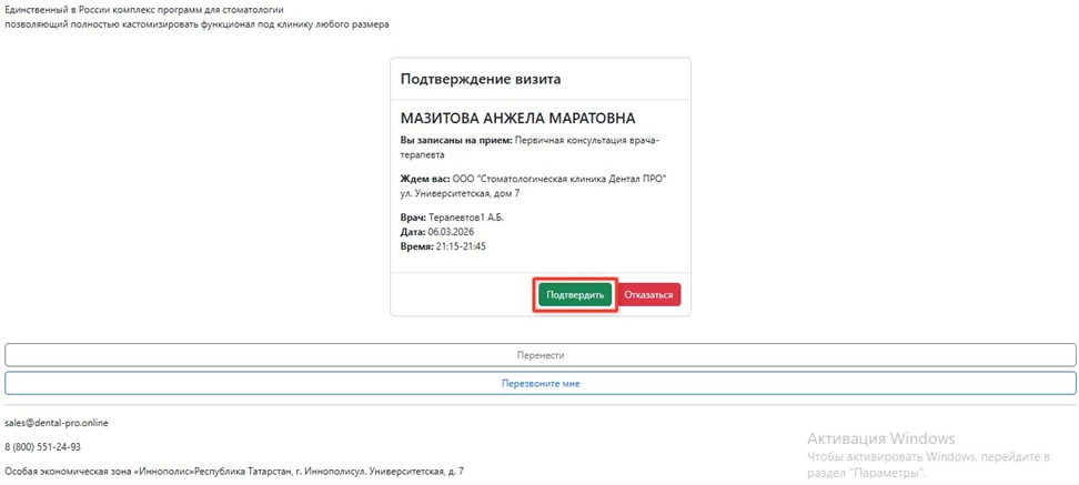В случае, если пациент подтверждает свой прием, на открывшейся странице необходимо выбрать опцию “Подтвердить”.