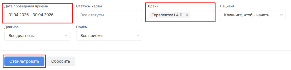 ● найти карты по конкретному периоду проведения приема,