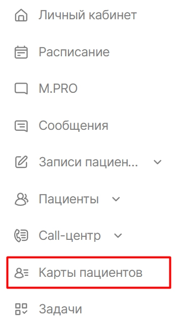 Выберите модуль “Карты пациентов” в меню слева.