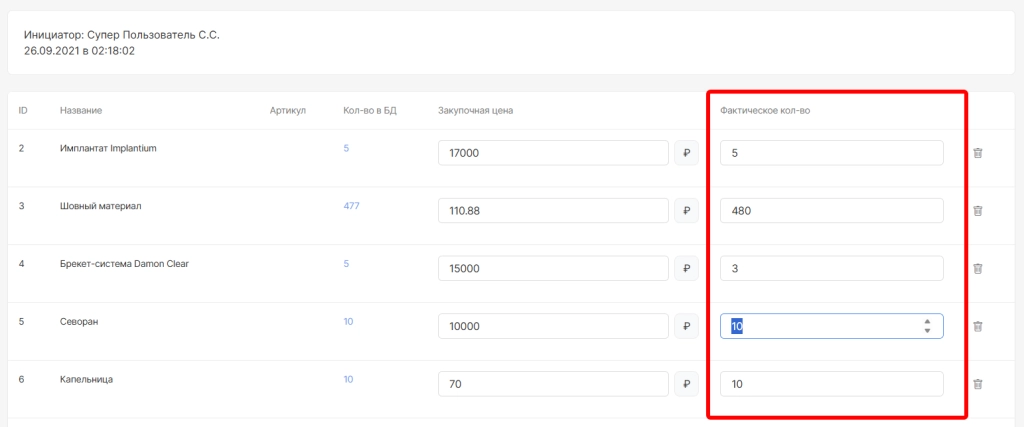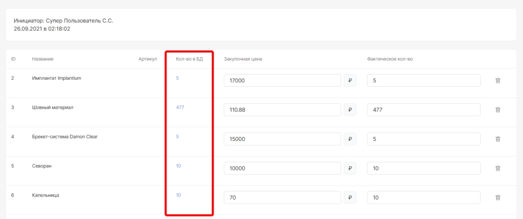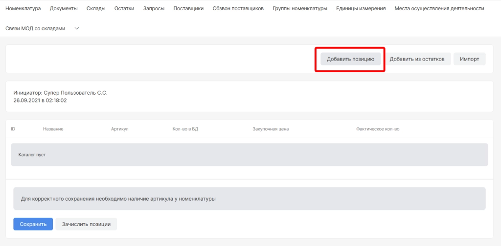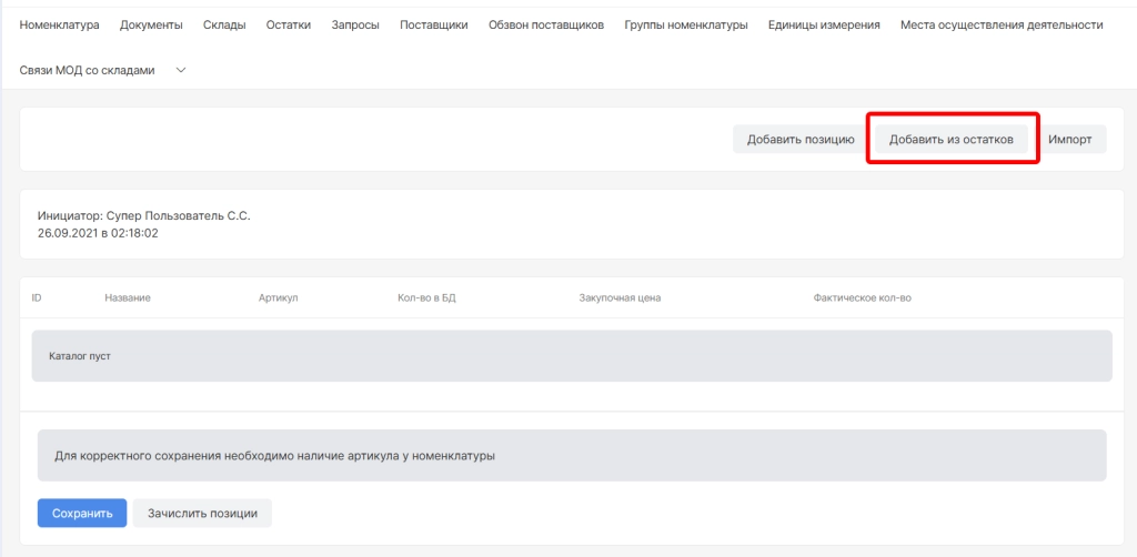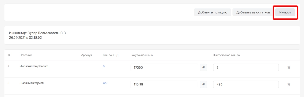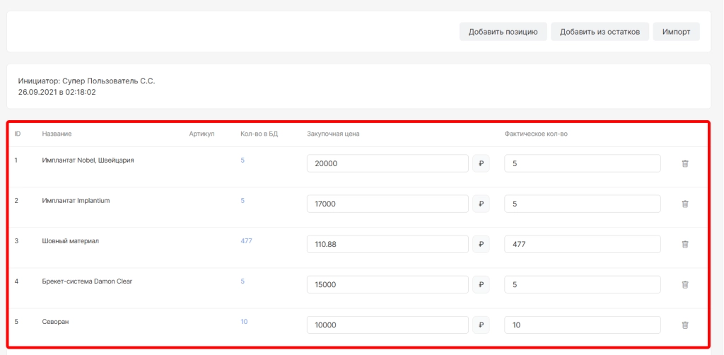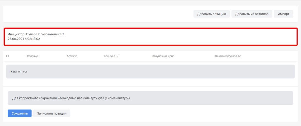 После использования опций “Зачислить из остатков” и “Добавить позицию” ниже отобразится: