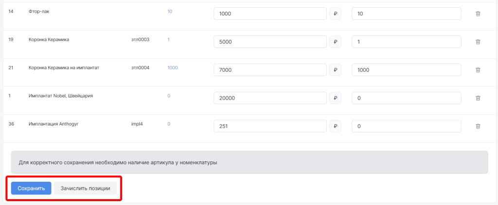 после просмотра и корректировки по всем позициям внизу страницы необходимо нажать “Сохранить” (для сохранения введенных изменений) и “Зачислить позиции” (для проведения документа в системе)