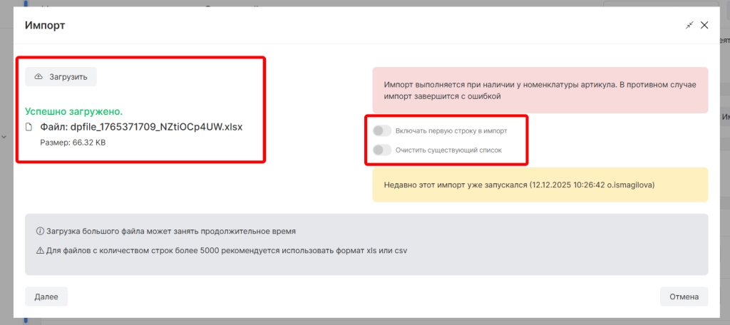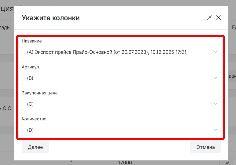 на следующем шаге импорта необходимо провести соответствие системных колонок со столбцами у загружаемого документа