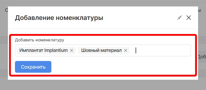 При выборе данной опции также необходимо будет указать номенклатуры для внесения и подтвердить выбор, нажав “Сохранить”